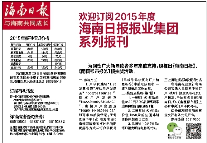 为回馈广大新老读者多年来的支持,现推出《海南日报》、《南国都市报》订报抽奖活动。