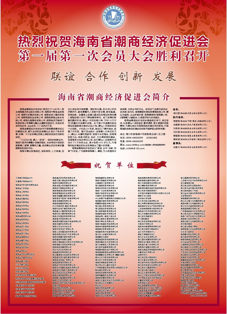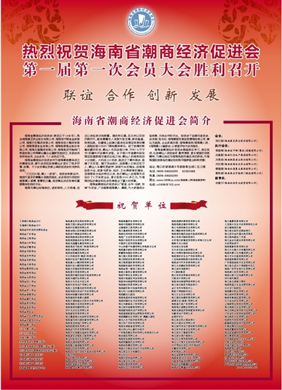 海南省潮商经济促进会提倡相互学习、相互促进,弘扬潮汕人团结奋进、勤劳勇敢、爱乡爱国的民族精神,为潮汕地区与海南架起沟通往来的桥梁,为海南国际旅游岛的建设和实现中国梦做出积极贡献!