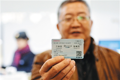 12月24日,旅客王东伟展示自己购买到的第一张由兰州始发高铁车票。 兰新高铁将于12月26日全线开通运营,售票工作已于24日10时30分开始。 新华社记者 陈斌 摄