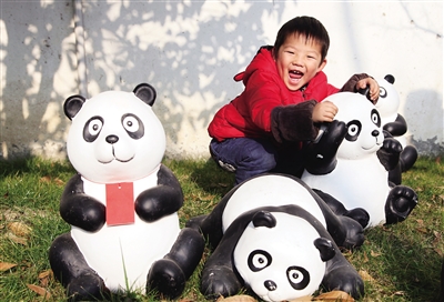 12月24日,一名小朋友在上海金山枫泾古镇跟大熊猫雕塑合影。 近日,300只形态各异的大熊猫雕塑“入驻”上海金山区枫泾古镇,给迎接新年的江南古镇增添喜气。 新华社发(庄毅 摄)