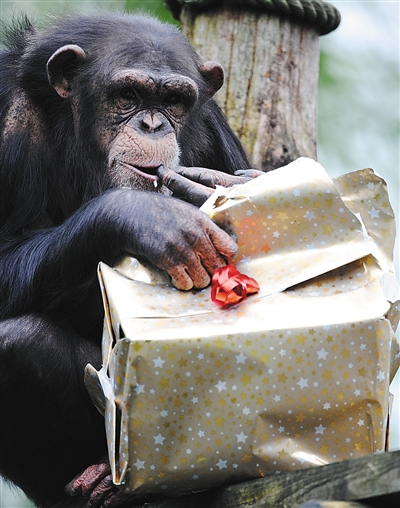 12月23日,在法国拉弗莱什动物园,一只黑猩猩打开装有食物的圣诞礼物包裹。 新华社/法新