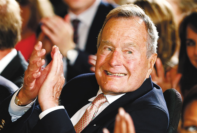 现年90岁的美国前总统乔治·赫伯特·沃克·布什(老布什)12月23日晚因出现呼吸困难被送往休斯敦的一家医院进行观察治疗。老布什1924年生于美国马萨诸塞州,于1989年至1993年期间担任美国第41任总统。 这是2013年7月15日老布什在美国华盛顿白宫出席一个颁奖仪式的资料照片。 新华社/路透
