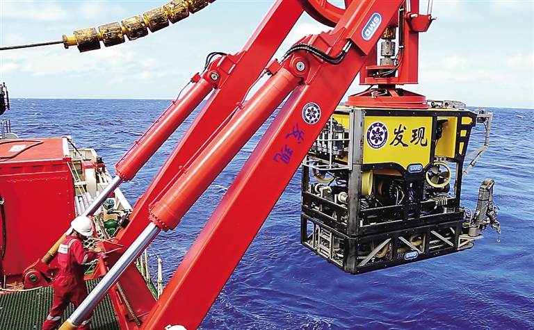 这是“发现”号ROV深海机器人(12月23日摄)。 12月23日,正在西太平洋进行科学考察活动的“科学”号科考船上搭载的“发现”号ROV深海机器人(水下缆控潜水器)下潜至雅浦海山海域接近4200米深处,挑战设计极限。“发现”号ROV机器人装备了温度计、生物采集器、采泥箱等,是开展深海探测研究的先进工具。 新华社记者 赵琬微 摄
