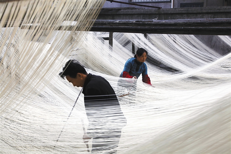 福建省莆田市荔城区是著名的传统食品生产基地,区里的传统食品生产专业村生产的西天尾扁食、兴化米粉、线面等畅销海内外。 图为12月24日,荔城区黄石镇的线面生产专业村井后村,村民在晾晒线面。新华社发
