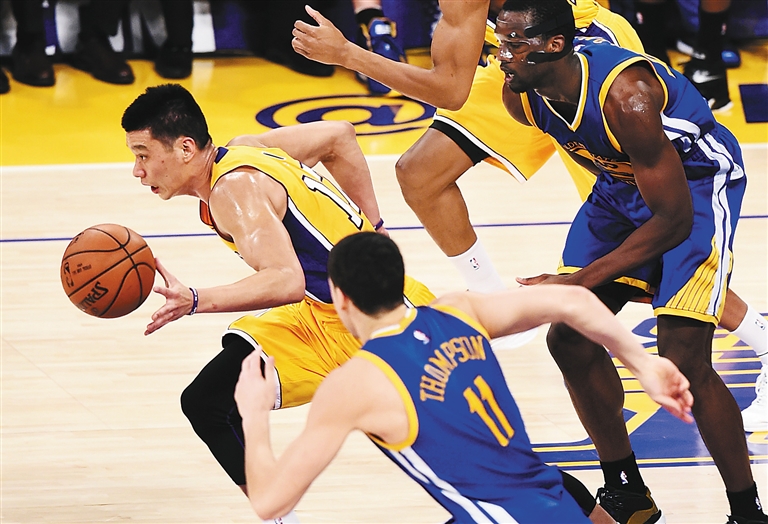 24日,在NBA常规赛中,湖人队主场以115:105胜勇士队。 图为湖人队林书豪(左)在比赛中带球进攻。 新华社发