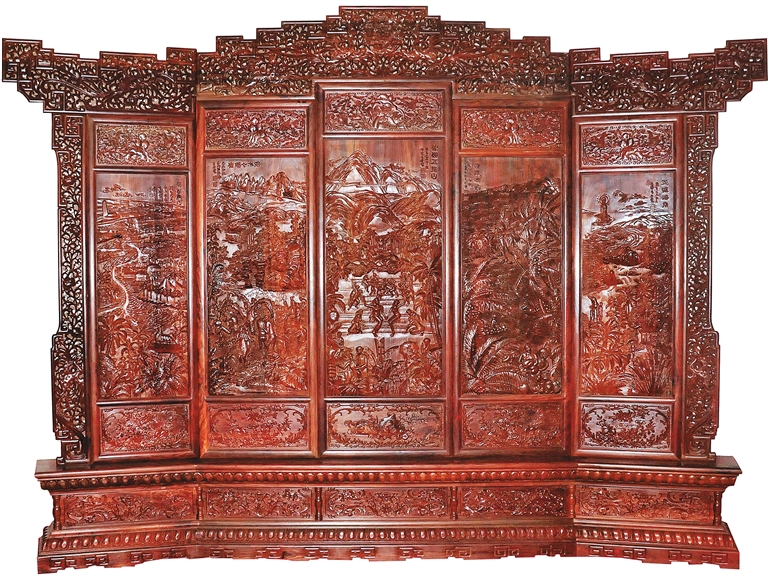吴名光认为,这两年红木家具的走红,其中一个很重要的原因是现在人们对于中国传统文化的认同感和回归感。琼作红木家具继承了中国古典家具榫卯结构,造型庄重等传统工艺。海南古典家具早期工匠来自京作、苏作、广作的能工巧匠,各地的工艺聚集在一起,碰撞与改良,逐渐升华形成了具有海南特色的工艺特点,既有京作的气派豪华,有苏作的格调细腻,也有广作的大方庄重。同时,为了突出地方特色,“琼作”红木家具设计制作中,也不断融入海南本土元素。以海南国盛古典家具有限公司制作的“天下第一屏——天赐琼崖”为例,该作品以故宫金銮殿龙椅座后屏风制式为标准,在图案设计中融入地域元素,屏风分为5扇,正面雕有海南最具代表性的五大自然美景:天涯海角、椰风海韵、五指山、七仙岭、万泉河;背面分别刻有和乐蟹、嘉积鸭、东山羊、文昌鸡、千岁龟等海南五大传统名菜,是百年海南享誉国内外的五道人文风景。此屏风大气磅礴,既充盈着明清皇家尊贵的气派,观之有风生水起之感,又将热带海岛的人文自然风情表现得淋漓尽致,故取名:“天赐琼崖”,寓意海南深受上天宠爱。该屏风在2010年上海世博会展出,吸引了众多眼球,受到观展世界友人的高度赞誉。