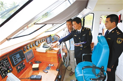 12月24日,三亚海事局执法大队在对景区旅游船只进行安全检查。