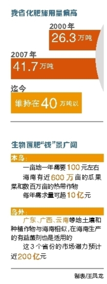 业内人士也表示,海南农产品出岛较多,也闻名于全国,但是农资产业却很小,不少农药、化肥、有机肥、机械等都需要依靠岛外输入,我省可以以微生菌剂为切入口,发展农资产业。“海南农资市场每年可达数十亿元,这部分市场目前八成是被岛外农资产品所占据。”
