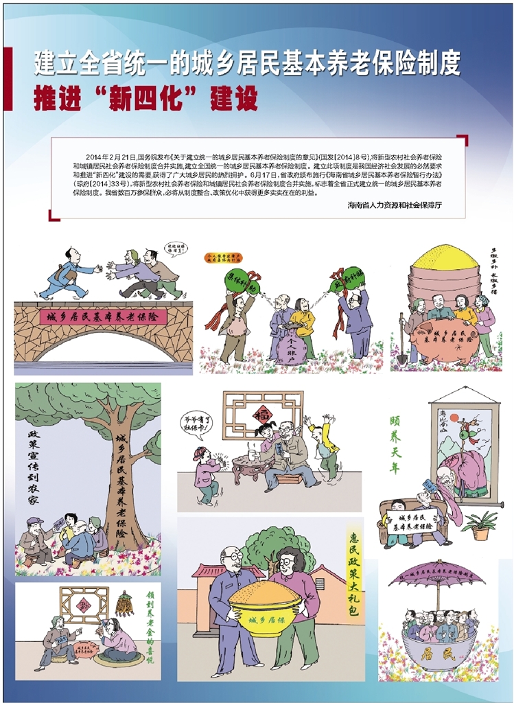 2014年2月21日,国务院发布《关于建立统一的城乡居民基本养老保险制度的意见》(国发〔2014〕8号),将新型农村社会养老保险和城镇居民社会养老保险制度合并实施,建立全国统一的城乡居民基本养老保险制度。建立此项制度是我国经济社会发展的必然要求和推进“新四化”建设的需要,获得了广大城乡居民的热烈拥护。6月17日,省政府颁布施行《海南省城乡居民基本养老保险暂行办法》(琼府〔2014〕33号),将新型农村社会养老保险和城镇居民社会养老保险制度合并实施,标志着全省正式建立统一的城乡居民基本养老保险制度。我省数百万参保群众,必将从制度整合、政策优化中获得更多实实在在的利益。