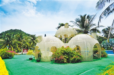 岛的中部山林草地起伏逶迤,绿影婆娑,处处花香鸟语,弥漫着小清新的气息。顺着绿径一直走,必然会路过几个造型奇异的球形建筑。看过冯小刚导演的《私人订制》,对影片中的会客厅必然印象深刻。在那里,一个又一个稀奇古怪的念头诞生,开展了一出又一出的闹剧。因为电影的火爆,拍摄场景变成了需要额外单独收费的景点。我们隔着栅栏使劲的瞅了瞅,不过巴掌大点地方,一眼望尽,就不去花那冤枉钱了。倒是栅栏外鲜花满簇,色彩缤纷,与远处的碧海相呼应,热带风情浓郁。
