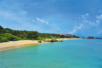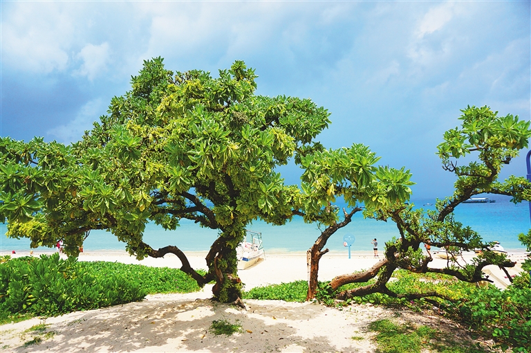 岛不大,却地形丰富。西部及北部平缓延伸入海,形成一弯玉带状的银色沙滩,沙质均匀细腻,色泽洁白如雪,海水由浅入深,颜色由透明而碧绿继而浅蓝,后而深蓝,明丽动人,层次分明。这里也成了游客们最钟爱的地方。在沙滩上尽情的玩耍。情侣和爱人居多,总是可以看见成双成对的身影,满满的都是爱意。