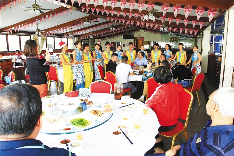“海南好呀海南好呀,海呀么海南好……”12月18日,位于三亚市三亚湾路的益龙海景渔村餐饮店里,从一间包厢传出了嘹亮的歌声。