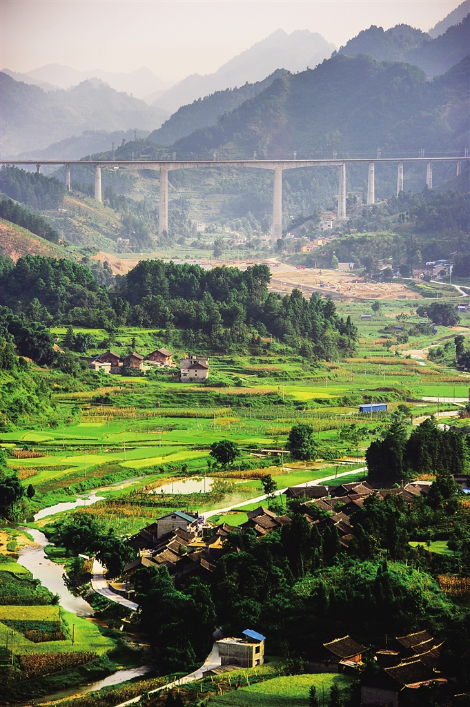 贵广高铁一座桥梁跨过贵州省黔东南州榕江县郊外的村庄(8月21日摄)。 晨尝广州虾饺鲜,午游桂林漓江美,夜宿贵州吊脚楼……从12月26日开始,贵广高铁开跑,各路小伙伴即可搭乘动车奔跑起来,在一日之内体验南中国“最温柔的风景线”。