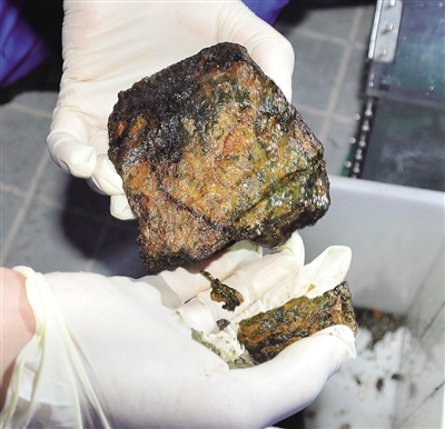 这是“蛟龙”号采集到的海底硫化物样品(12月26日摄)。 12月26日,“蛟龙”号载人潜水器执行印度洋首次科学应用下潜,采集到硫化物“烟囱”碎片及岩石矿物样本20公斤。 新华社发
