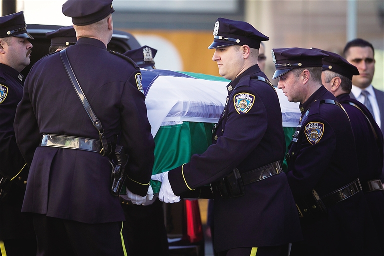 12月26日,被黑人男青年枪杀的警察拉斐尔·拉莫斯的葬礼在纽约举行。12月20日,两名纽约警察拉斐尔·拉莫斯和刘文健在布鲁克林区执勤时被28岁黑人青年伊斯马艾伊·布林斯利枪杀。 新华社/路透