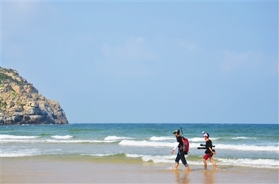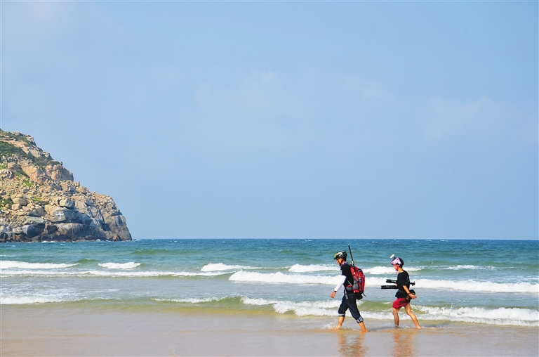 骑行的前期,一天五六十公里的行程,腿抽筋、脚起泡自然在所难免,可令队员们没想到的是,他们收获了更多。文昌市铜鼓角附近的大澳湾,此前让队员们向往已久,这次骑行而至,他们发现:这里比想象中更美。那是午后三四点钟,队员们停下单车,卷起裤脚,肆意在海滩上踏浪,一道波浪打来,手指大小的银白色小鱼竟然跳到了脚上,“鱼儿在阳光的照射下仿佛会发光一样,感觉太奇妙了!”回想起当天的情景,三个人仍忍不住感叹,“最幸运的是,我们头上的镜头拍下了这珍贵的画面。”