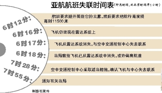 印尼交通部高官说,失联航班当地时间5时35分(北京时间6时35分)从印尼泗水起飞,本应于新加坡时间8时30分(北京时间8时30分)抵达新加坡樟宜机场。但客机在起飞42分钟后与印尼控制塔失去联系。
