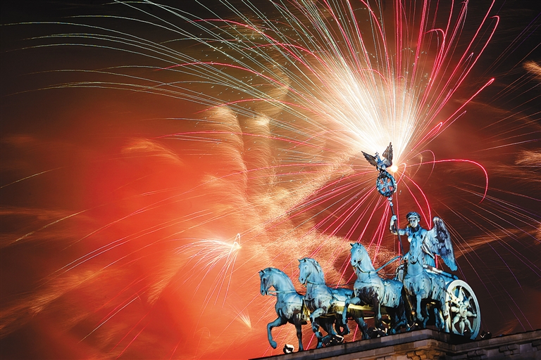 ①庆祝新年到来的焰火在德国柏林勃兰登堡门上空绽放。