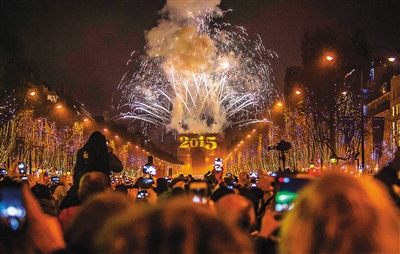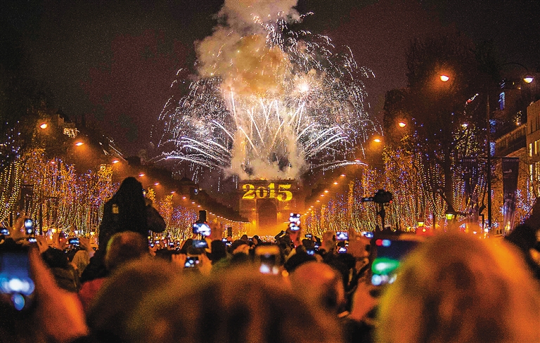 在“10”“9”“8”“7”“6”“5”“4”“3”“2”“1”十个数字依次“跃”上法国巴黎凯旋门后,“2015”字样最终定格在这座位于香榭丽舍大街西端的建筑上,绚烂的烟花点亮了巴黎的夜空,“花都”用一场令人难忘的声光盛宴迎来了崭新的一年。