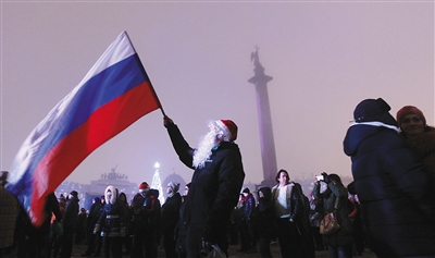 ②人们在俄罗斯圣彼得堡冬宫前的广场上欢庆2015年到来。