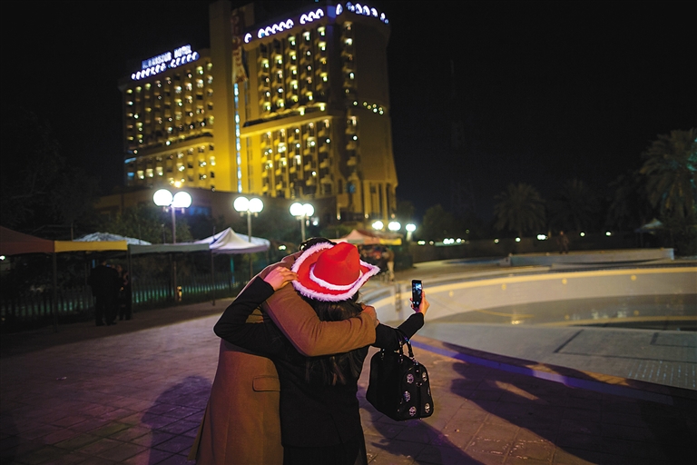 ⑤在伊拉克首都巴格达的曼苏尔酒店,一对恋人在新年到来之际用手机自拍。