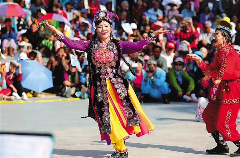 元旦期间,三亚湾海月广场,“候鸟”文艺爱好者跳起欢乐的民族舞蹈。本报记者 武威 通讯员 向天 摄
