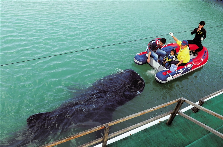 1月2日,在国家5A级旅游景区陵水分界洲岛海豚湾,游客在给鲸鲨喂食。元旦假期,游客与鲸鲨、海豚、海狮等海洋动物互动,以及潜水、摩托艇等玩海项目尤受青睐。