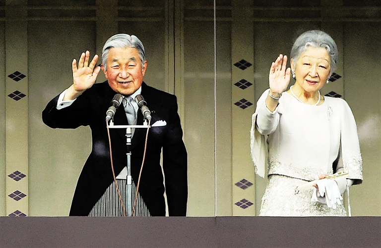 1月2日,日本明仁天皇(左)和皇后在东京向民众挥手致意。日本明仁天皇1日在发表新年感言时说,日本应该借二战结束70周年之际反思战争历史,思考今后走向,这是当下极其重要的事情。 新华社/法新