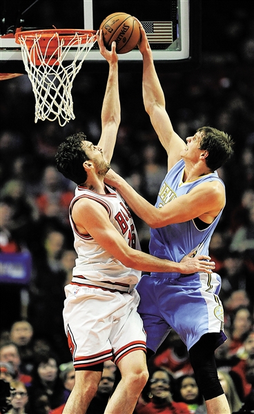1月2日,在2014-2015赛季NBA常规赛中,公牛队主场以106比101战胜丹佛掘金队。图为公牛队球员加索尔(左)在比赛中盖帽。