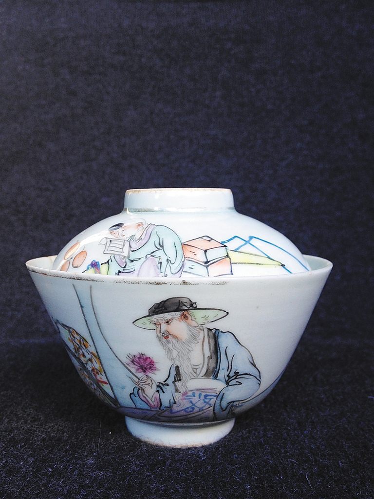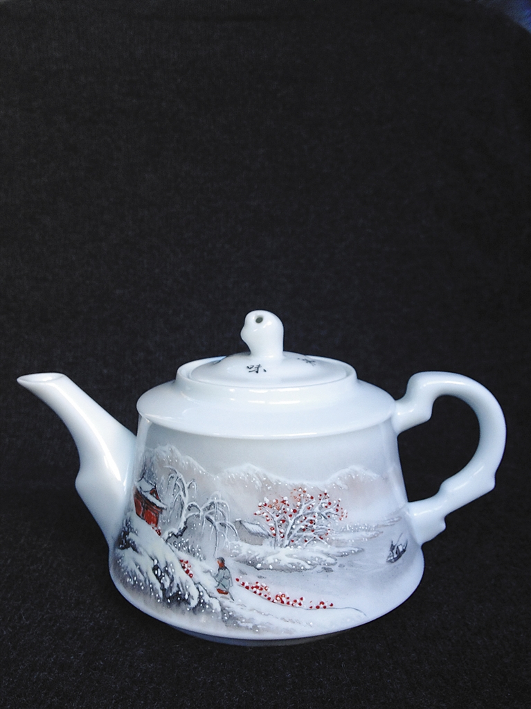 孔女士举着手里的一把茶壶告诉记者,这是中国陶瓷艺术大师袁世文的作品,其舅公汪野亭系景德镇“珠山八友”之一。袁号称雪景大王,这把雪景壶于方寸之间表现远山白雪皑皑,近处风雪归人,中景小舟野渡,在南方无雪的冬日把玩别有一番意境。