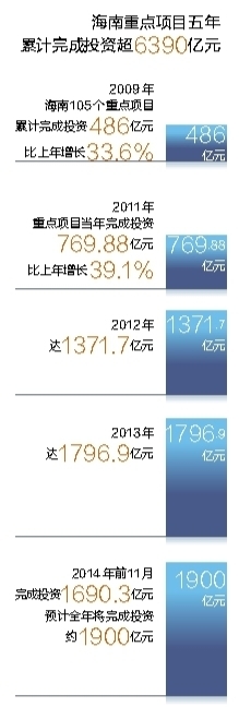 政策效应远未止步。2012年迄今,海南省重点项目均突破千亿元大关,其中2012年、2013年分别达1371.7亿元、1796.9亿元。2014年前11月已完成投资1690.3亿元,预计全年将完成投资约1900亿元,五年累计完成投资超6390亿元。