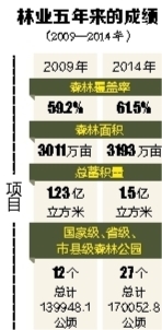 5年来,全省森林面积从2009年的3011万亩增加到2014年的3193万亩;活立木蓄积量从1.23亿立方米增加到1.5亿立方米;森林覆盖率从59.2%提高到2014年的61.5%,年均增长0.4个百分点,实现了森林面积、森林蓄积量、森林覆盖率三增长,为我省生态环境质量持续保持全国领先奠定了坚实基础。