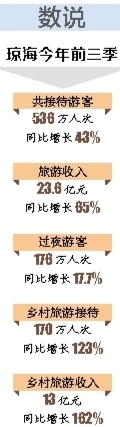 2014年前三季,琼海共接待游客536万人次,同比增长43%;旅游收入23.6亿元,同比增长65%;其中,过夜游客176万人次,同比增长17.7%;乡村旅游接待170万人次,同比增长123%;乡村旅游收入13亿元,同比增长162%。