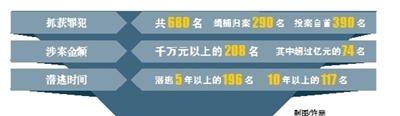 公安部部长助理、“猎狐2014”专项行动领导小组副组长孟庆丰在8日召开的公安部新闻发布会上对外通报上述成果。他介绍,从抓获逃犯的涉案金额来看,千万元以上的208名,其中超过亿元的74名;从潜逃时间看,抓获潜逃5年以上的196名,其中10年以上的117名,时间最长的22年。
