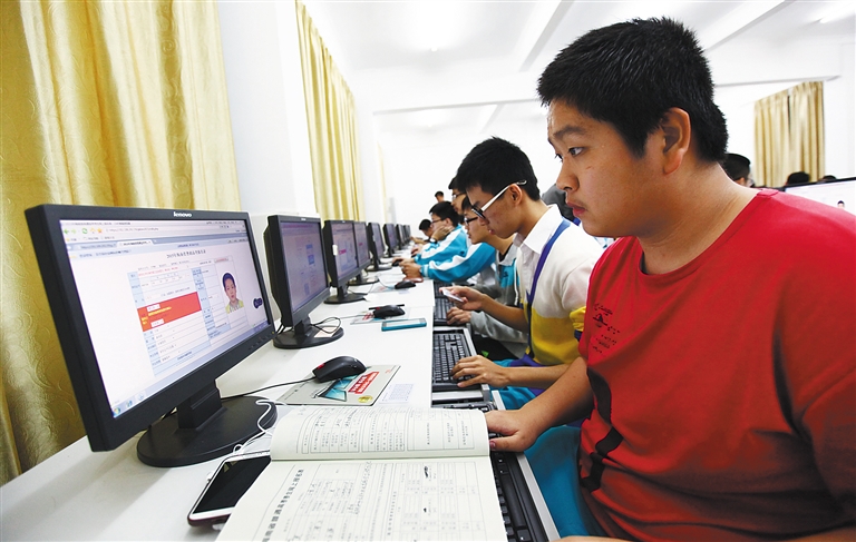 1月8日,海南中学高三学生登录2015年海南省普通高考报名系统进行报名。当天,海南今年高考报名工作正式开始,持续至本月12日。