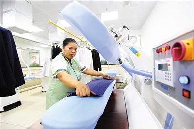 1月8日,海航自强洗衣社首家门店在海航大厦举行试营业典礼。这个专门为残疾人就业而开办的公益洗衣社,将有望随着海航集团的发展延伸到全国各地。图为海航自强洗衣社员工在干洗衣服。