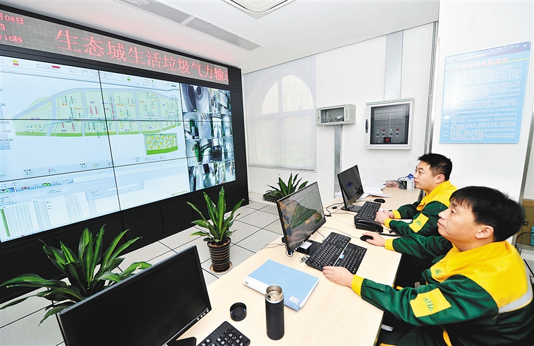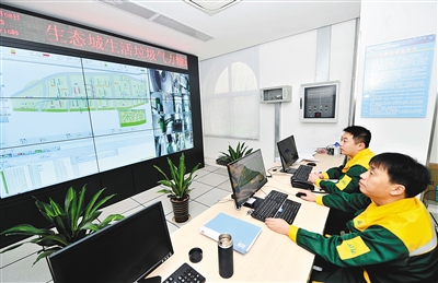 1月8日,两名工作人员在2号机组中央垃圾收集站控制室监控。 近日,由天津中新生态城环保公司投建的垃圾气力输送系统2号机组投入使用,可服务2.6万人,设计规模为25.78吨/日,三名工作人员实现全天候操作。居民将小件的生活垃圾投放至气力垃圾投放口,垃圾在抽风机负压作用下通过直径为半米的密闭管道被“吸”到中央垃圾收集站,进行分类压缩并回收,避免了传统垃圾收集、运输过程中的二次污染。 中新生态城垃圾气力输送系统共4套机组,可覆盖建筑面积达530万平方米,服务10万人,计划在2015年底全部建成并完成调试,成为全国规模最大的垃圾气力输送系统。 新华社记者 岳月伟 摄
