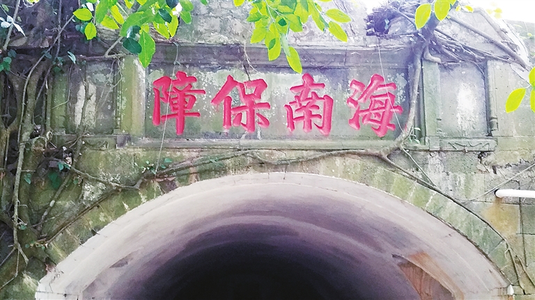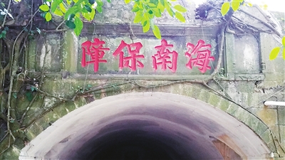 海口秀英炮台管理处坐落在“城堡”腹部东北角,是一栋红墙碧瓦,底层带长廊的二层仿古建筑,廊柱下分布三扇大门。管理处主任陈明忠从西侧门走出来,下得台阶,由一条石板路通向正对着的“城墙”拱门。拱门上“海南保障”四个大字,显然为后来所刻。“障”字写法特别,右边“立日十”中,“十”穿过了“日”。