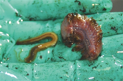 “蛟龙”号载人潜水器采集到的海底多毛类动物(1月11日摄)。 1月11日,中国载人潜水器“蛟龙”号继续在西南印度洋龙旂热液区下潜,采集到大量热液区生物,包括49个贻贝、300多个螺、20多个茗荷和20多个多毛类动物等。