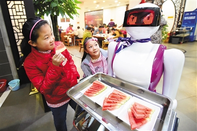 两位就餐的小朋友在观看智能机器人送餐(1月11日摄)。 近日,河南许昌一家火锅店引进一台智能机器人,在餐厅“跑堂”,吸引了众多市民游客前来“尝鲜”。据介绍,这台定制的智能机器人可以给客人送菜、唱歌助兴,价值8万余元。