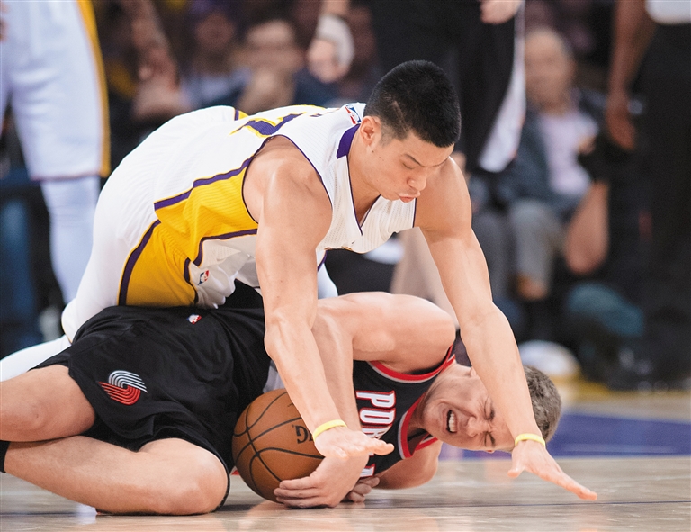 北京时间12日,在NBA常规赛中,洛杉矶湖人队主场以94:106负于波特兰开拓者队。图为湖人队球员林书豪(上)和开拓者队球员莱昂纳德争抢。新华社发
