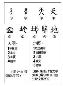 与“天”不同,“地”是个形声字,从土也声。《说文解字》说,开天辟地的时候,轻清上升而为天,属阳,重浊下降而为地,属阴,“万物所陈列也”。天圆地方,“万物所陈列”,讲明了大地对人间和万物的承载。这意思大略不错,只是解释得有些哲学化。