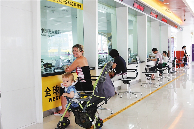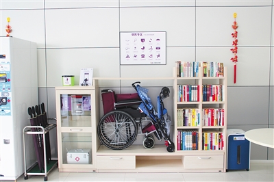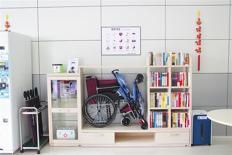 “在这里,我们还提供十五项便民服务:老花镜、放大镜、针线包、手机充电器、便民伞、报纸书刊、Wifi、婴儿车、轮椅、急救医药箱、碎纸机、现金清点机、光大银行服务热线、涉外服务窗口、残疾人士优先窗口。”光大银行蓝天支行相关负责人介绍。
