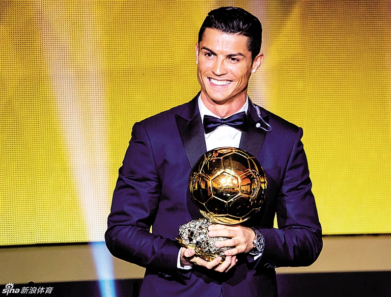 北京时间1月13日凌晨,2014年度国际足联颁奖盛典在瑞士苏黎世举行,C罗力压梅西和诺伊尔,蝉联金球奖。图为C罗笑捧金球。新华社发