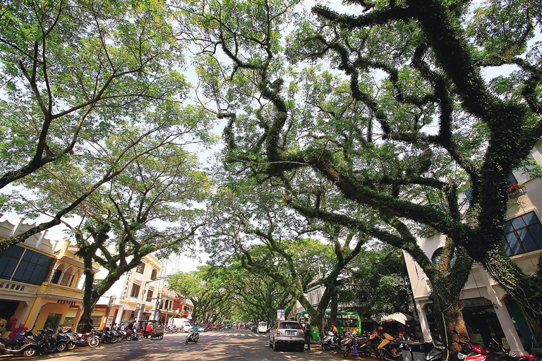 “这里的房子真漂亮,走在这条街上感觉真不错。”1月4日,漫步在琼海市中原镇墟主干道两旁高大雨树搭建起来的绿色走廊里,欣赏着街道两边色彩明丽具有南洋风情的小楼,来自湖北的陈莉莉举起相机,拍个不停。