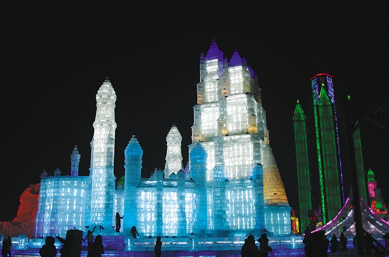 除了西方主题的诸多大型城堡和高塔,还能看到中国传统主题冰灯,比如追溯满族金源文化祭祀活动的大鼓状冰灯,还有天下粮仓和五谷丰登主题的冰灯。