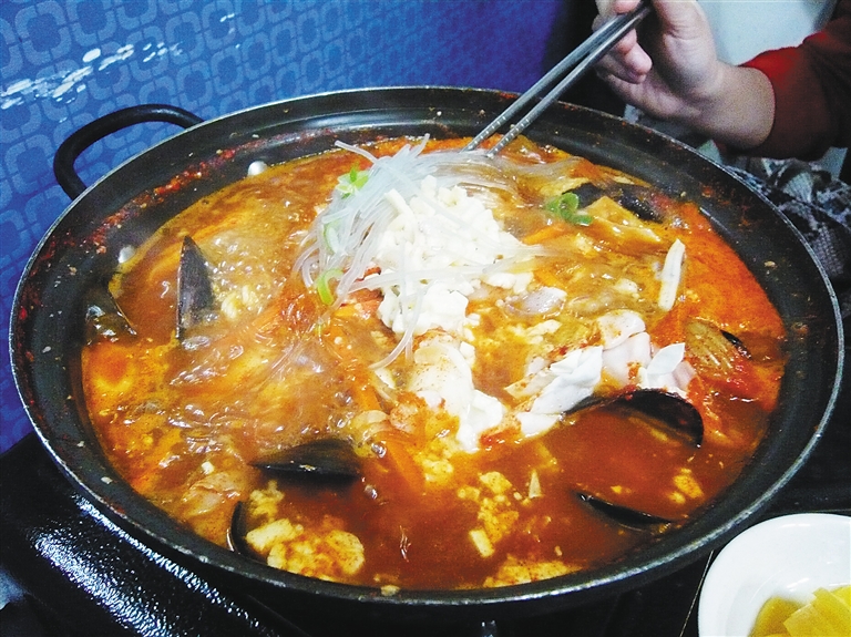 不一会,那位大妈给我们端上一圆口大铁锅。橘黄色的酱汤,中间是一大块方便面,周围整齐地堆着虾、黑蚬、火腿肠、午餐肉、年糕、泡菜以及各种蔬菜。来不及去细细地分辨都有哪些食材,但是这么一大锅,更像是东北的乱炖,而不是国内的涮锅。当锅煮沸后时,原本堆积整齐的食物,有一种火山爆发的架势瘫倒于锅中。肚饿的我,早已顾不上考虑该怎吃,又是肉又是菜又是面的,然后再把酱汤喝个大半。微辣,除了午餐肉的香味和泡菜的酸味,还夹杂一股芝士的淡淡甜味,甚是合我胃口。剩余的酱汤,或许是炖了许久已开始变得粘稠,刚才那位大妈服务员往里头倒入一碗米饭,并配点海苔和玉米粒,酱汤在慢慢地收汁,这样一份韩式拌饭就弄好了。雨天的午后,围着这一热腾腾的黑铁锅,有菜有肉有汤有饭,吃得我饱饱的、暖暖的,寒意也早已去无踪,一种幸福的感觉油然而生。