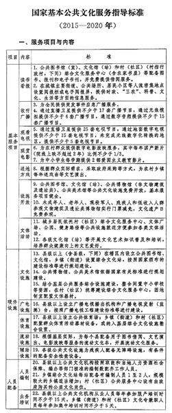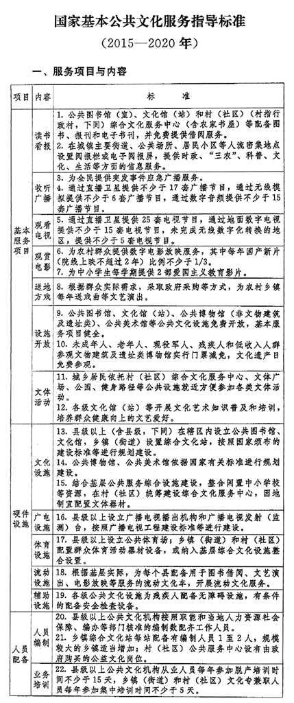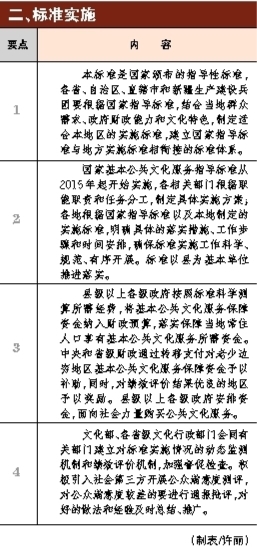 与意见一同印发的《国家基本公共文化服务指导标准(2015—2020年)》,对各级政府应向人民群众提供的基本公共文化服务项目和硬件设施条件、人员配备等作出了明确规定。在标准的基础上,各地将从实际出发,制定适合本地区的实施标准,并落实保障资金。有关部门将加大监督检查力度,对意见和标准的落实情况进行督查。