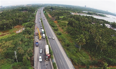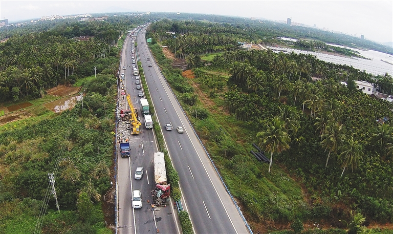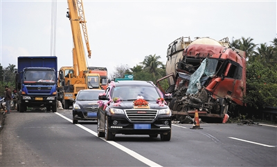 1月14日,俯瞰东线高速公路万宁市礼纪路段,当天凌晨约4时,三辆车相撞造成交通事故,高速路上车辆纷纷减速,一度堵成汽车“长河”。万宁交警部门接报后,及时出警进行处理,疏导交通。图为事故处理现场,充满喜庆的婚礼车队从满身伤痕的事故车旁经过,可谓一路同行,一边喜来一边忧。事故造成一人受伤,无人死亡。 本报记者 张杰 通讯员 曾觉 摄