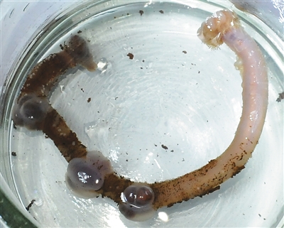 1月14日,中国载人潜水器“蛟龙”号在西南印度洋龙旂热液区下潜,采集到一透明生物以及一只30厘米长、直径3厘米的粉红色生物,随船科学家尚不能确认它们是何种生物。